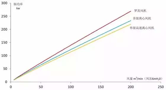 從上圖中可知,在風機的效率方面單級高速離心風機最高,多級離心風機其次,羅茨風機最低。同樣的供風量,羅茨風機能耗最高,單級高速離心風機能耗最低。