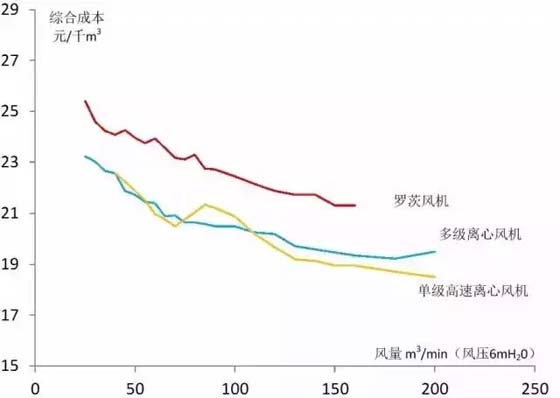 其中,羅茨風機由于能耗較高,單位流量綜合成本高于多級離心和單級高速離心風機。在100m3/min以上的流量時,由于單級高速離心風機具有更高的運行效率,綜合成本優(yōu)于多級離心風機。